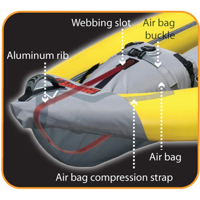 The Advanced Elements StraitEdge Inflatable Kayak is the first inflatable to incorporate an aluminum bow and stern frame to improve tracking in open water conditions. When the chambers are inflated these frame ribs press against the outer cover and form a high-performance bow and stern.