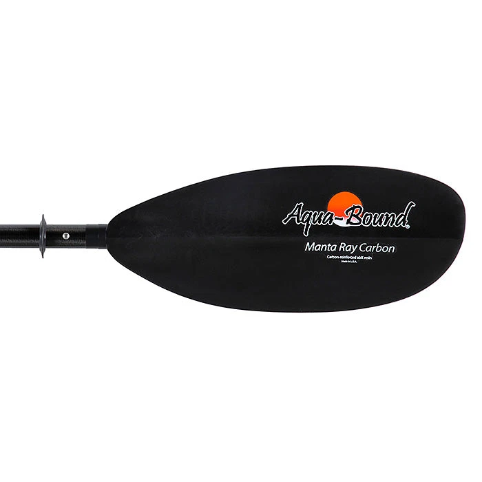 The Aqua-Bound Manta Ray Carbon 4-Piece Kayak Paddle has more horsepower for big boats, high-angle paddlers, and moving water. Its high-angle blade gives you increased control and more power, for a bigger bite on the water. The Manta Ray gives you great efficiency and more glide in each stroke.