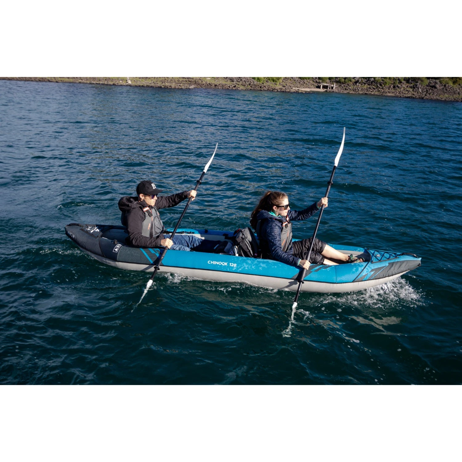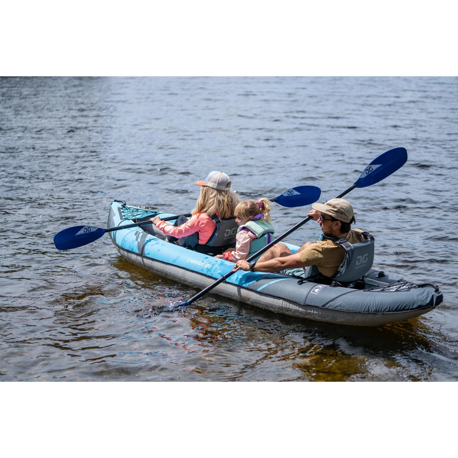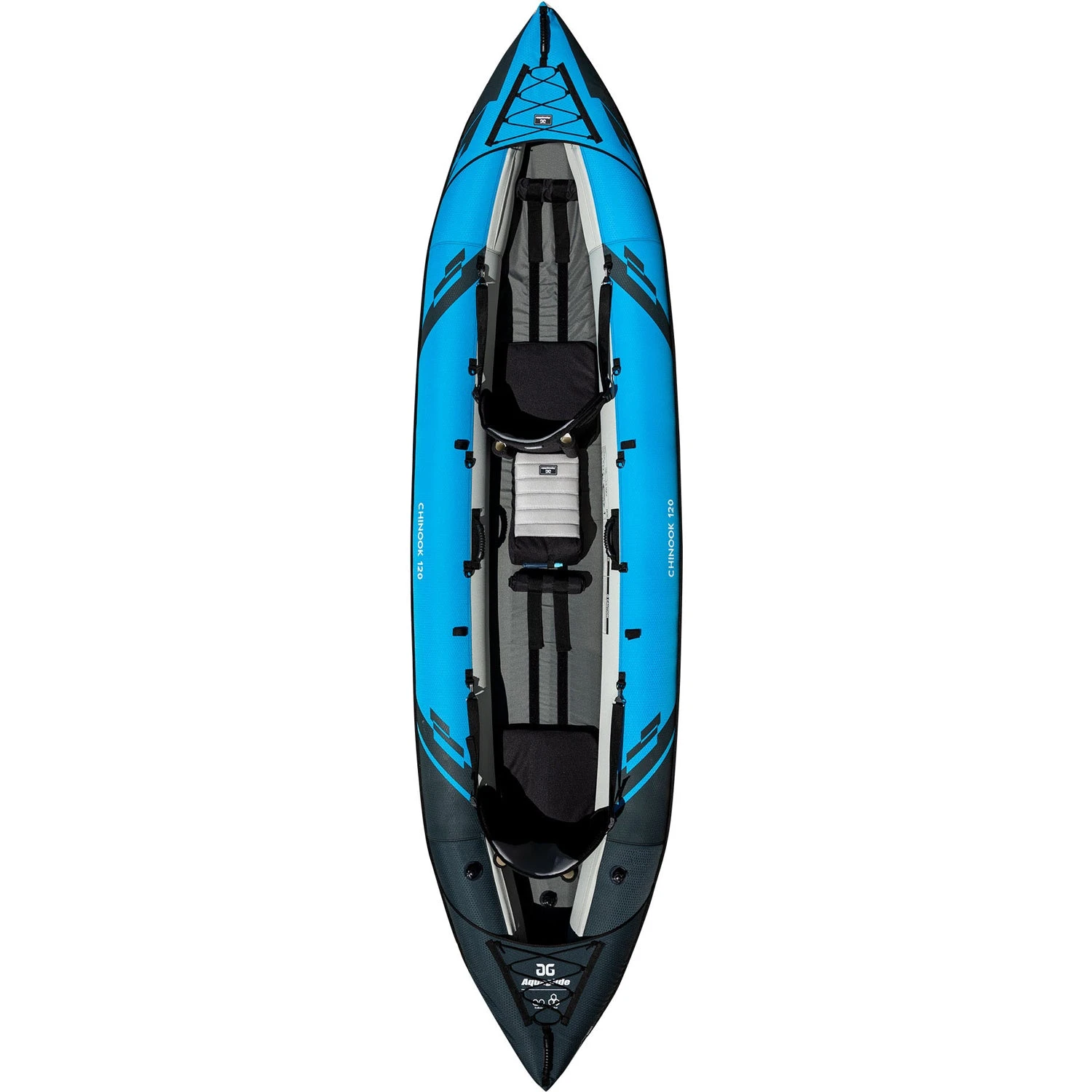 With its 12-foot open bow layout, the Aquaglide Chinook 120 Inflatable Kayak is ideal for tandem paddling with the capacity to carry a child, pet, or extra gear. A broad, stable shape of the Chinook results in a versatile, lightweight kayak that enables easy transitions in and out of the boat.