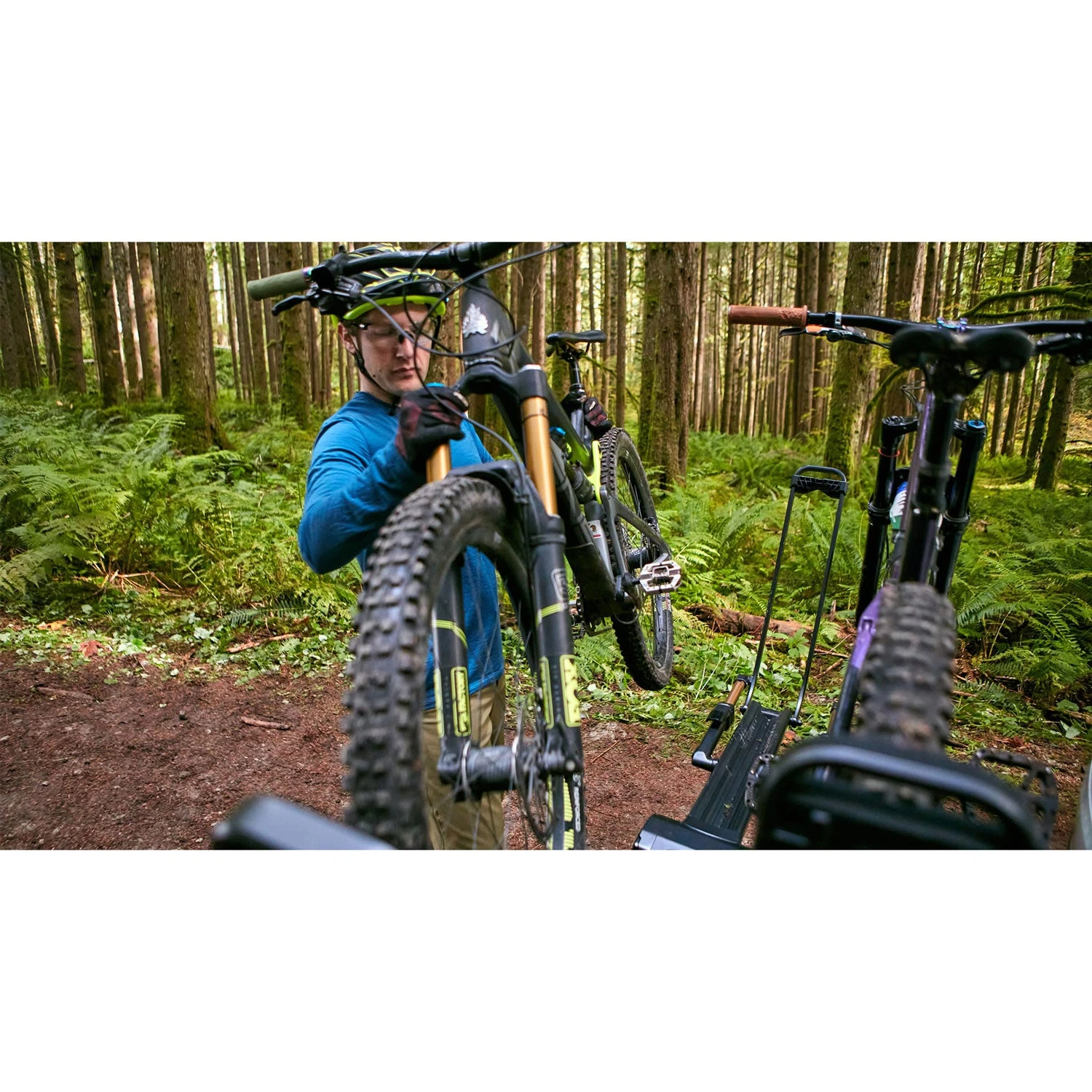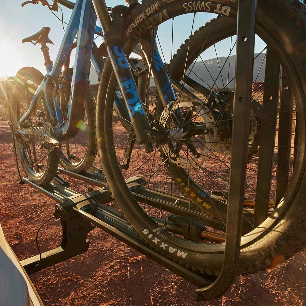 - Tiered trays increase spacing between bikes and minimize frame contact