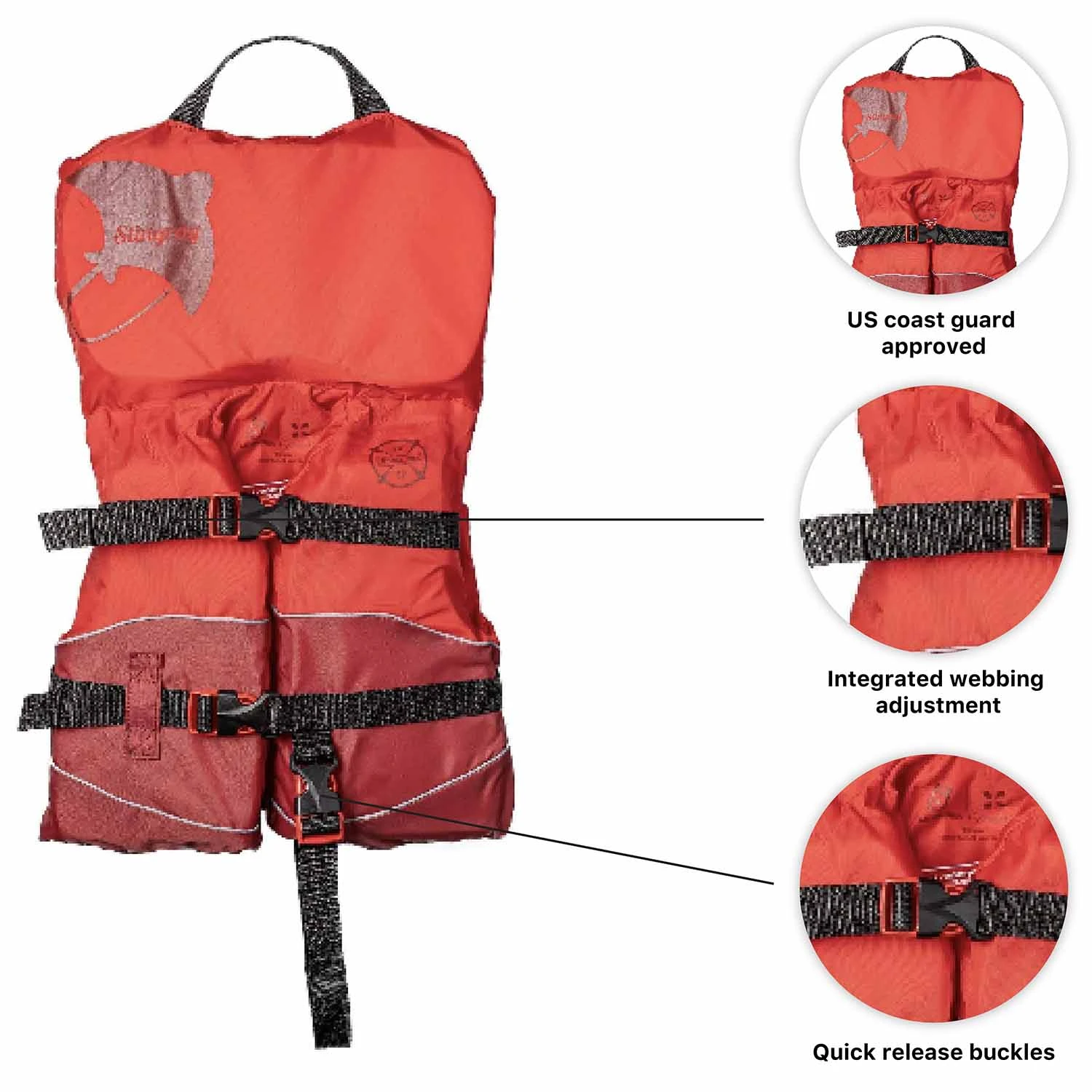 Made from a durable and quick-drying Nylon fabric with added reflective piping, the Level Six Stingray Child’s Lifejacket (PFD) will keep your child safe and visible. The strap adjustment system is incorporated into the PFD so there is no bunching or pulling while providing a secure custom fit.