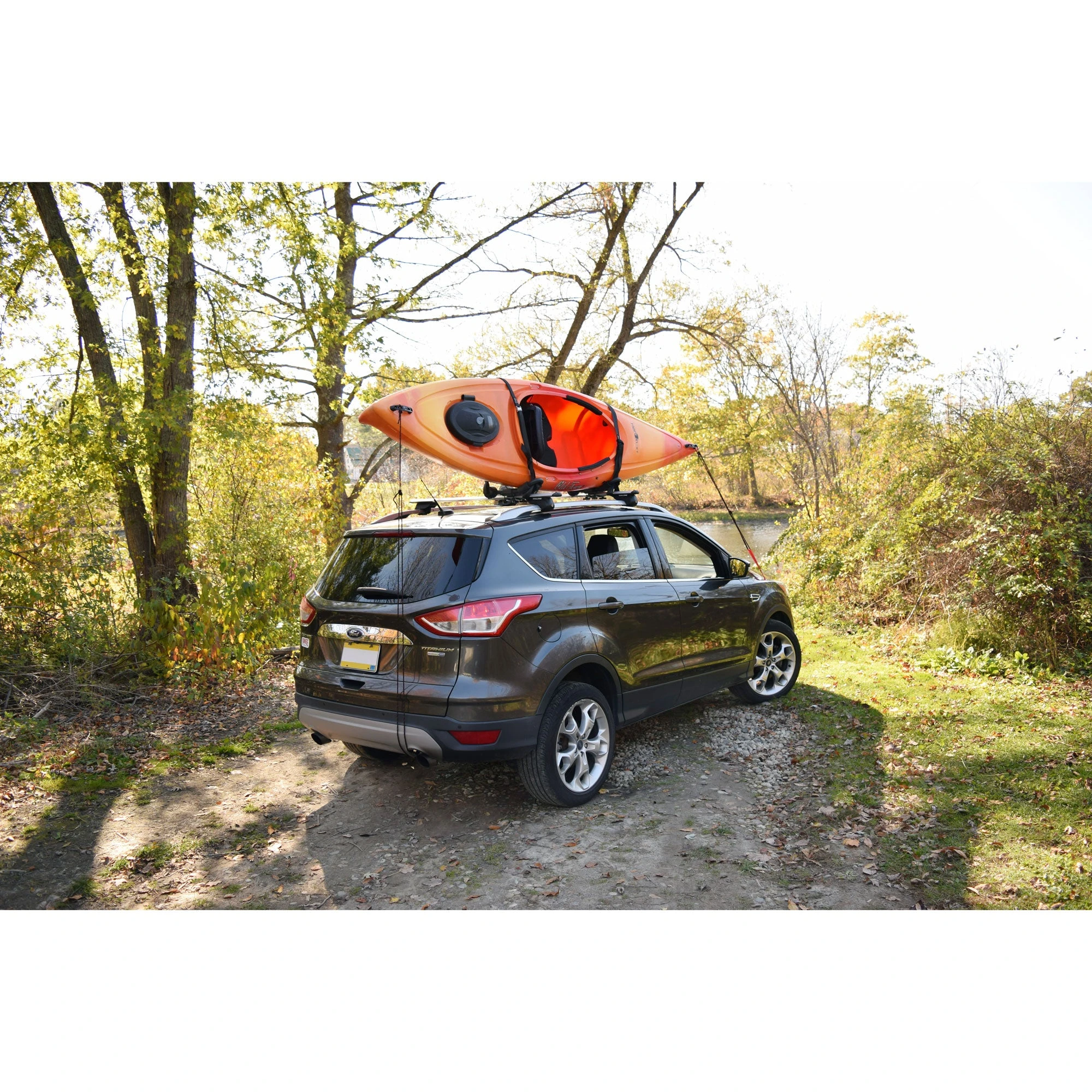 The Malone FoldAway-J Kayak Carrier is designed to safely carry a single recreational or touring kayak on its side. These carriers feature quick-release fold-down frames for low clearance and improved gas mileage when not in use. Built with corrosion-resistant coated steel oversized padding.