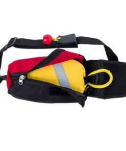 - A waist bag with quick-release belt holds a compact, removable throw bag