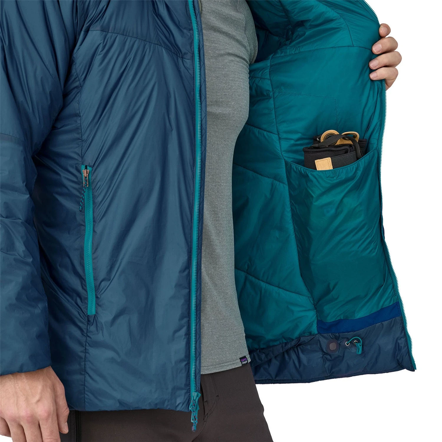 - External left-chest pocket and handwarmer pockets are outfitted with zipper garages