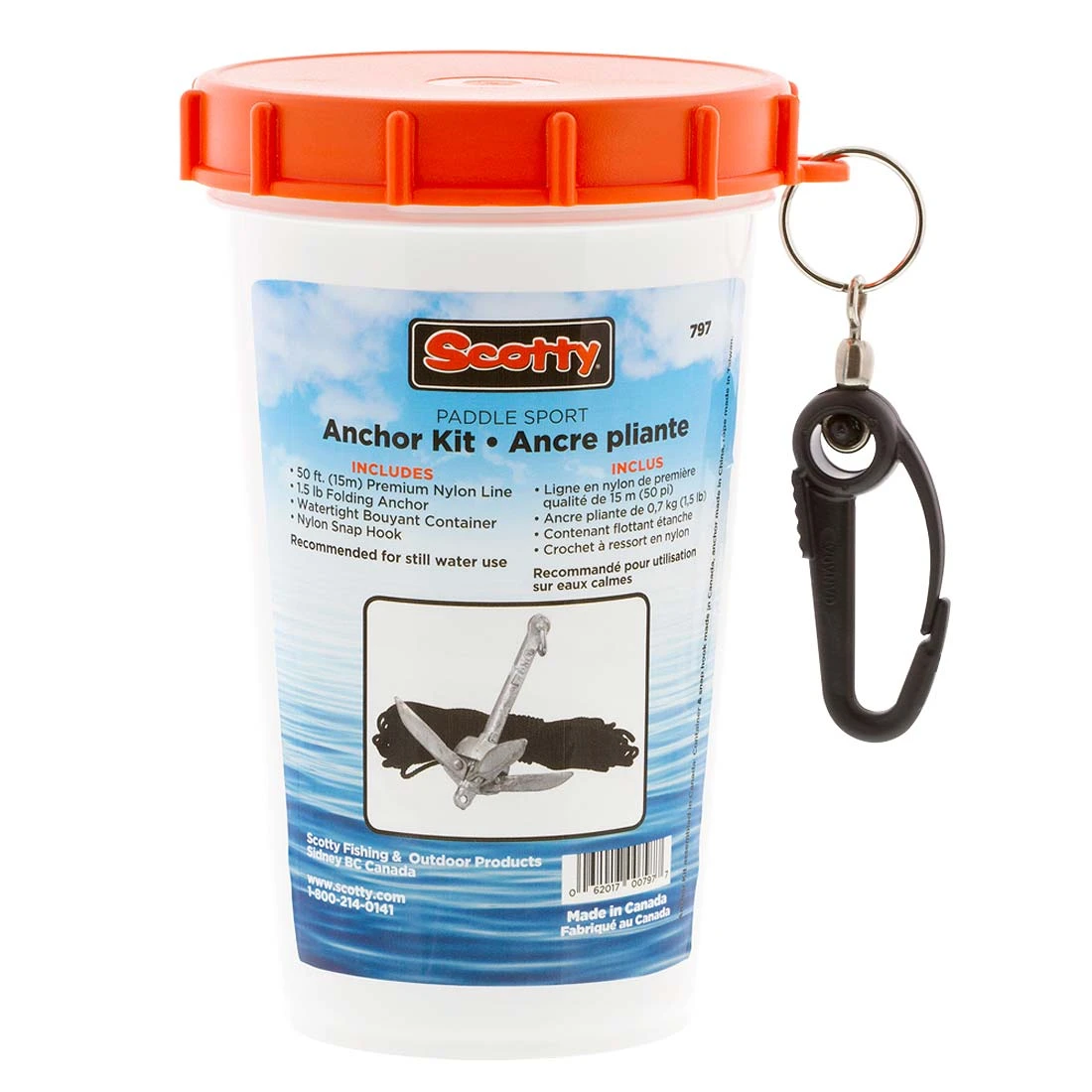 - Nylon snap hook on side of container for easy attachment to vessel