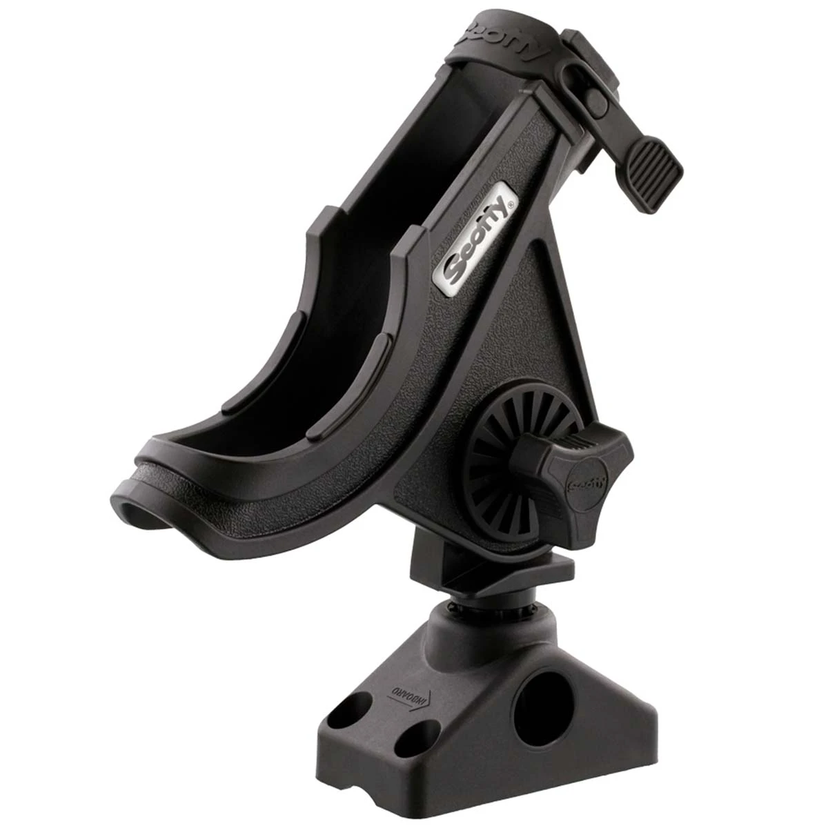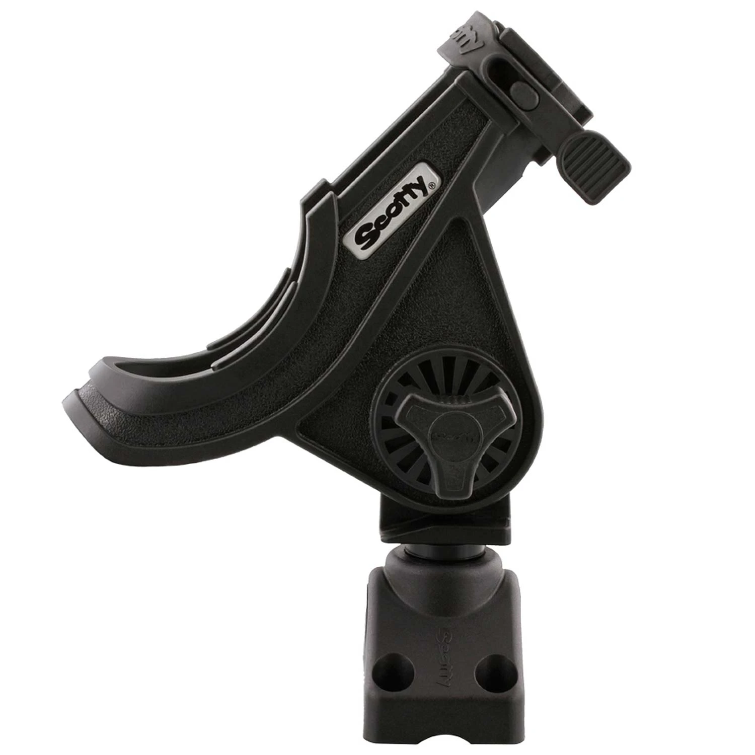 The Scotty Bait Caster Rod Holder adds a unique dimension to the sport of kayaking. It holds a baitcaster reel in a cushioned cradle with a slot in the front of the holder allowing for a spinning reel to be securely held in position. A side-mounted flange leaves the bottom open for rod trigger grips.