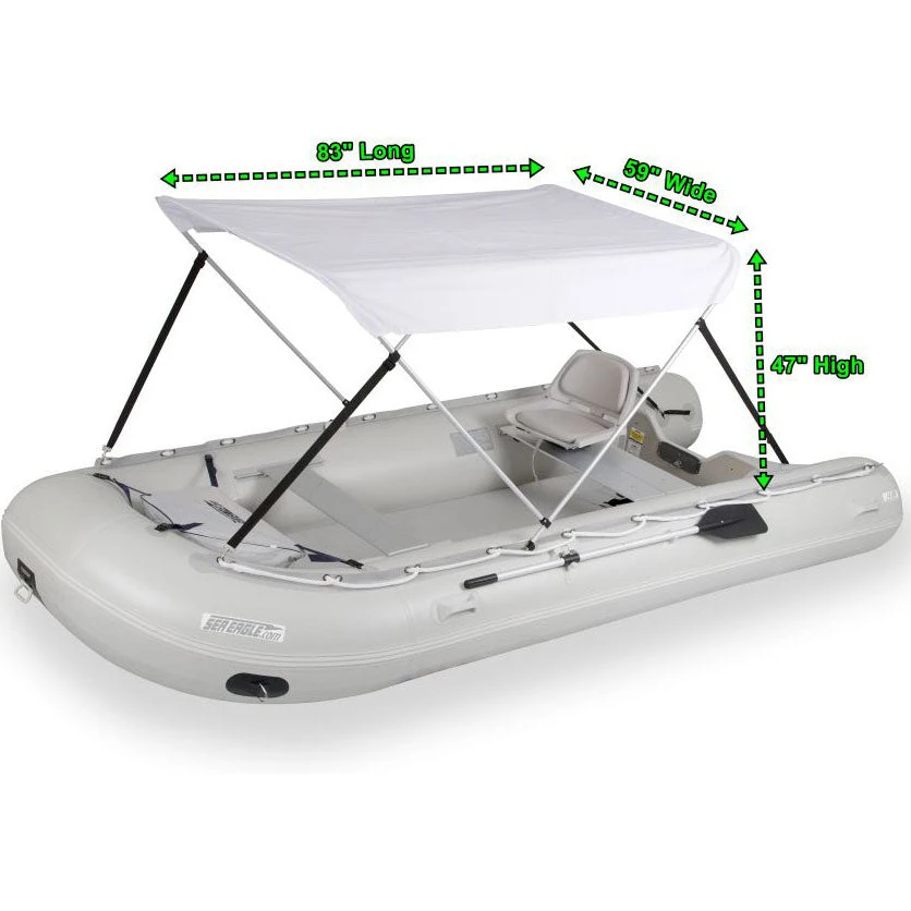 The Sea Eagle 14′ Sport Runabout Swivel Seat Canopy Drop Stitch Inflatable Raft Package is a favorite of larger groups as well as police and fire departments alike. The great advantage of these boats is their lightweight to size ratio. Which increases stow-ability and reduces overall hull weight.