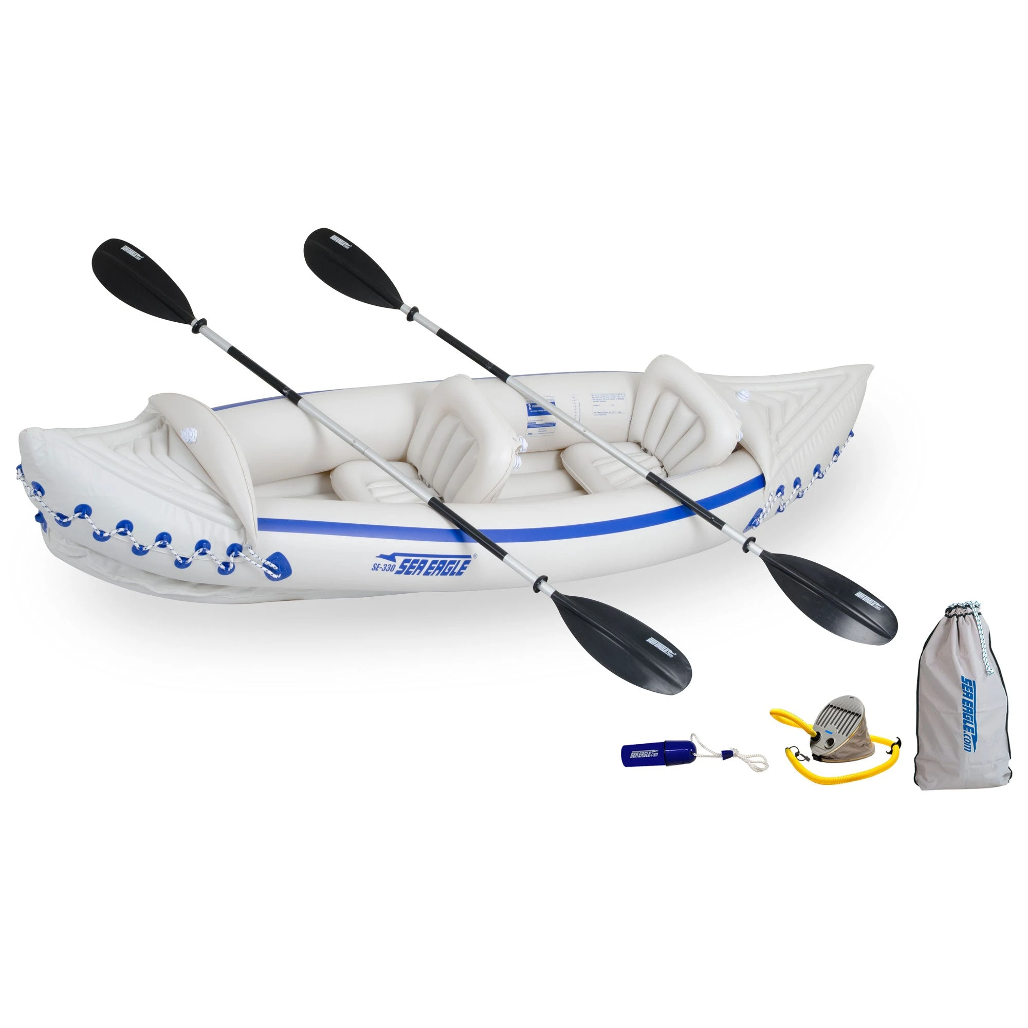 The Sea Eagle Sport SE330 Inflatable Kayak is the ultimate weekend getaway boat that goes anywhere. Don’t let the weight fool you, at just 26 lbs. it’s a rugged kayak able to hold two people yet easy enough to be carried and paddled by one and packs down small enough to fit in the smallest car trunk.