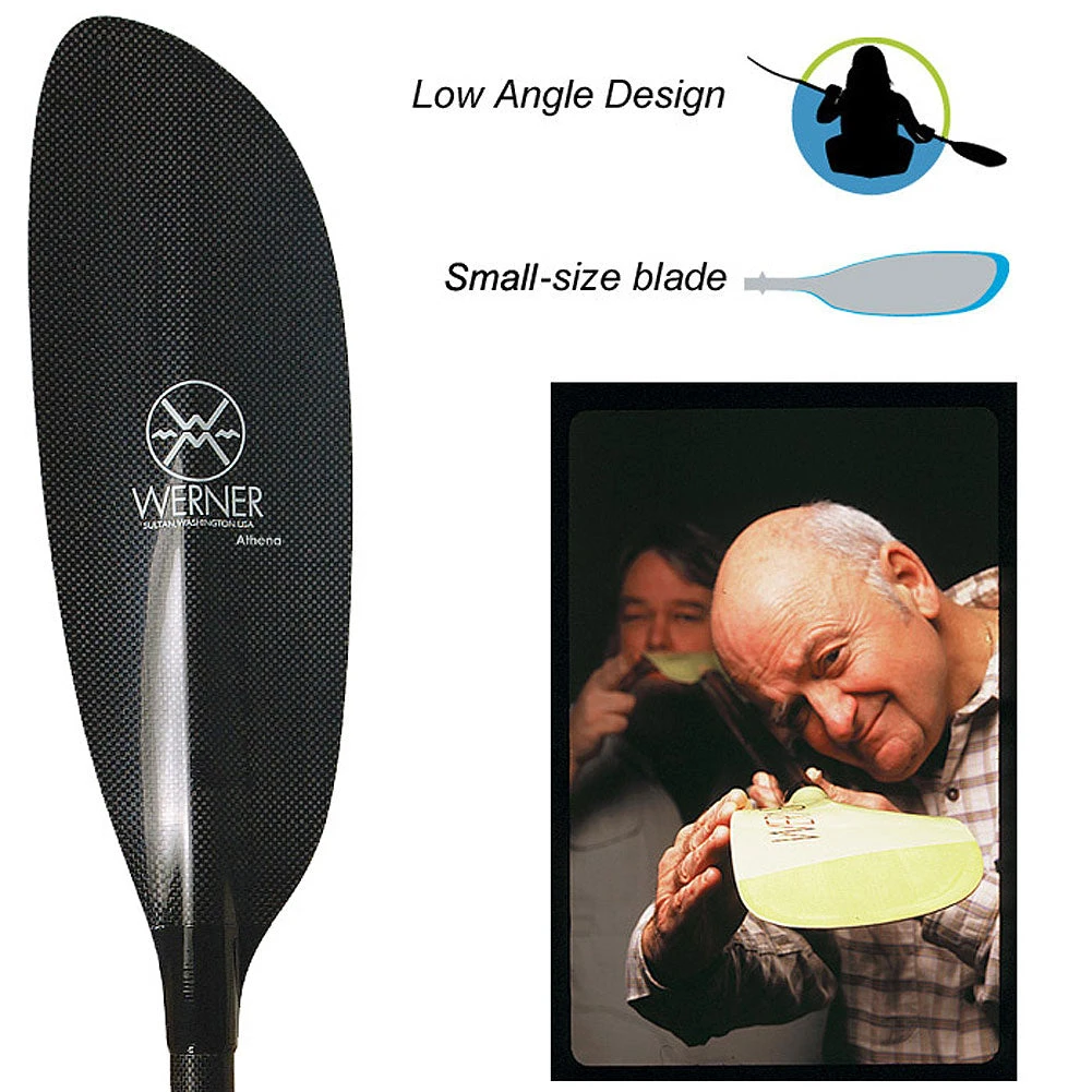Named after the Greek goddess of wisdom, the Athena kayak paddle is Werner’s most elegant touring design. The small-sized blades are gentle on your joints and pull effortlessly through each stroke, allowing you to use a faster cadence with less impact on your body.