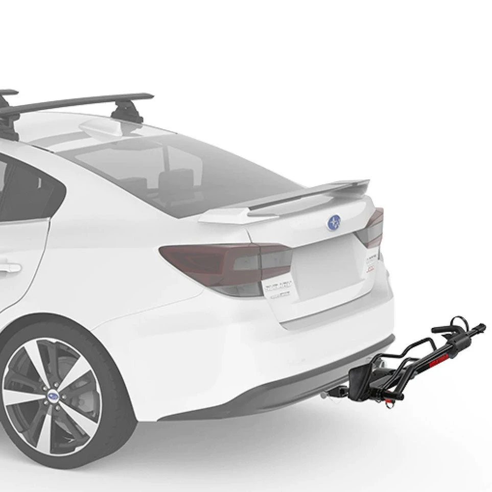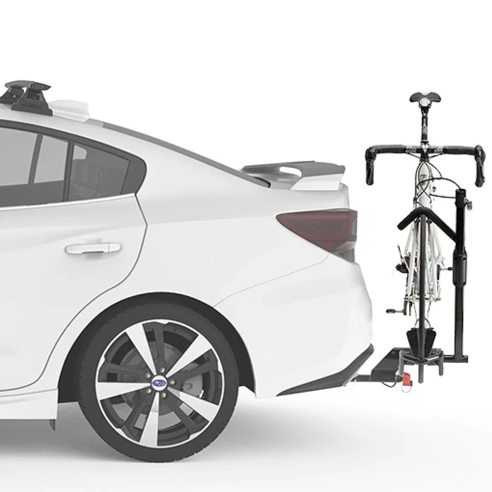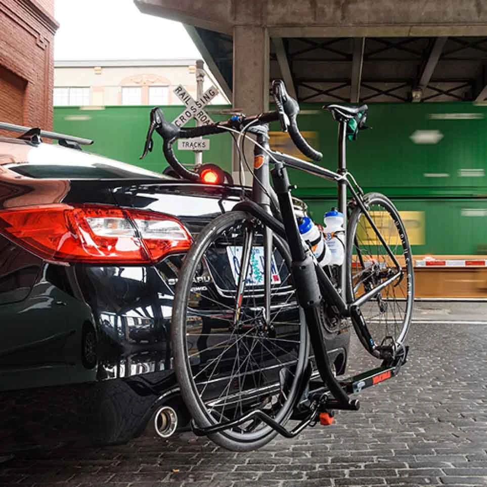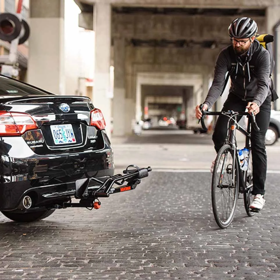 - Lightweight hitch-mounted tray rack loads quickly and carries one bike